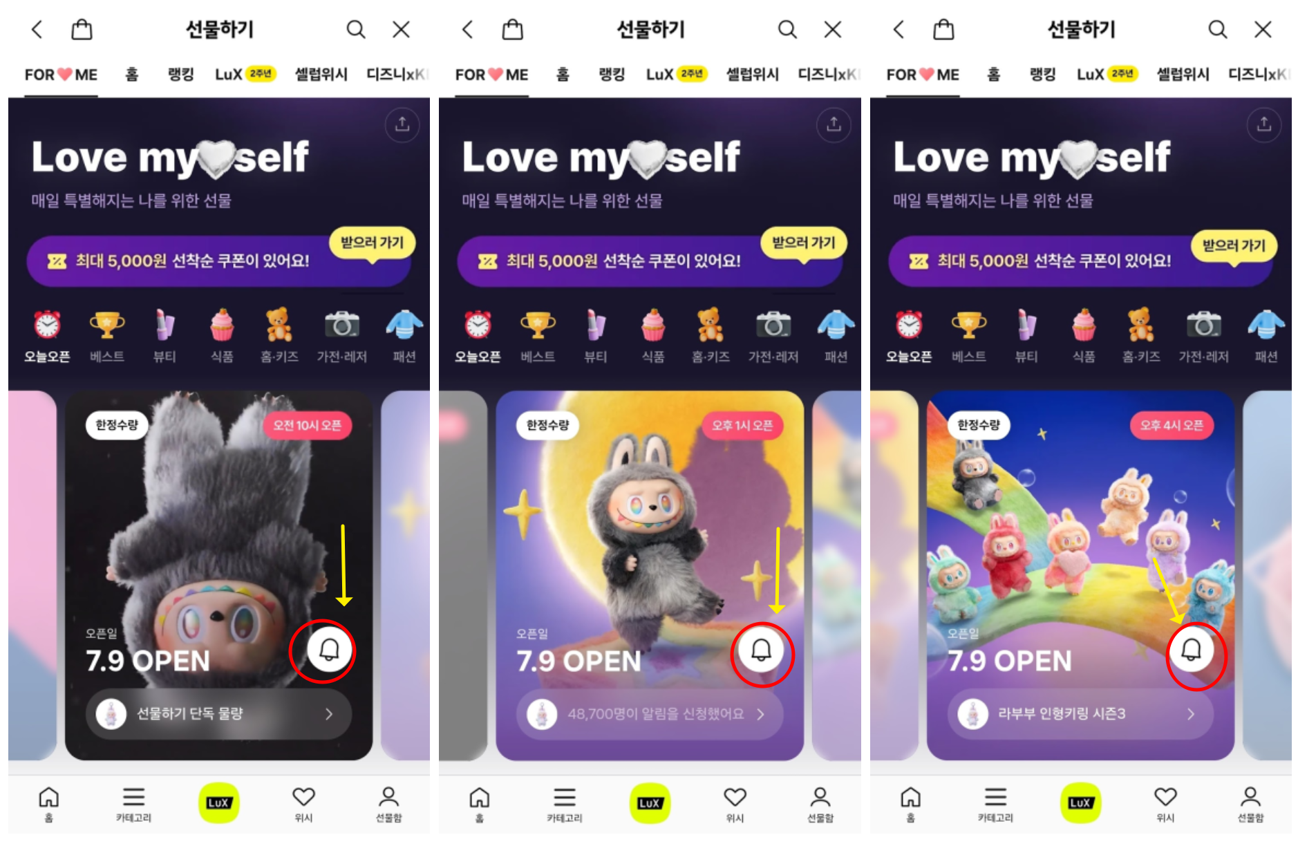 1단계: '알림 신청'은 필수!지금 바로 카카오톡 앱 실행 → '선물하기' 선택 → 상단 검색창에 'FOR ❤️ ME' 클릭 → 중앙배너 왼쪽으로 이동 '7.9 OPEN' 3개의 상품' 에서 오른쪽 하단 [알림 신청]을 3개의 시간대 상품을 찾아 누르세요. 판매 시작 시 가장 먼저 알림을 받을 수 있습니다.
