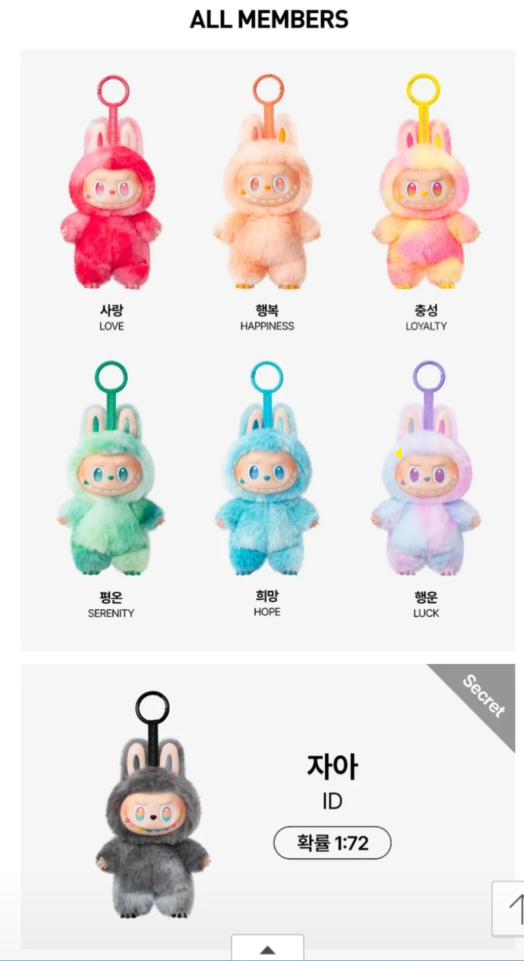 | 판매 상품 | 라부부 더 몬스터 하이라이트 시리즈 키링 (6종+히든 1종 랜덤) |