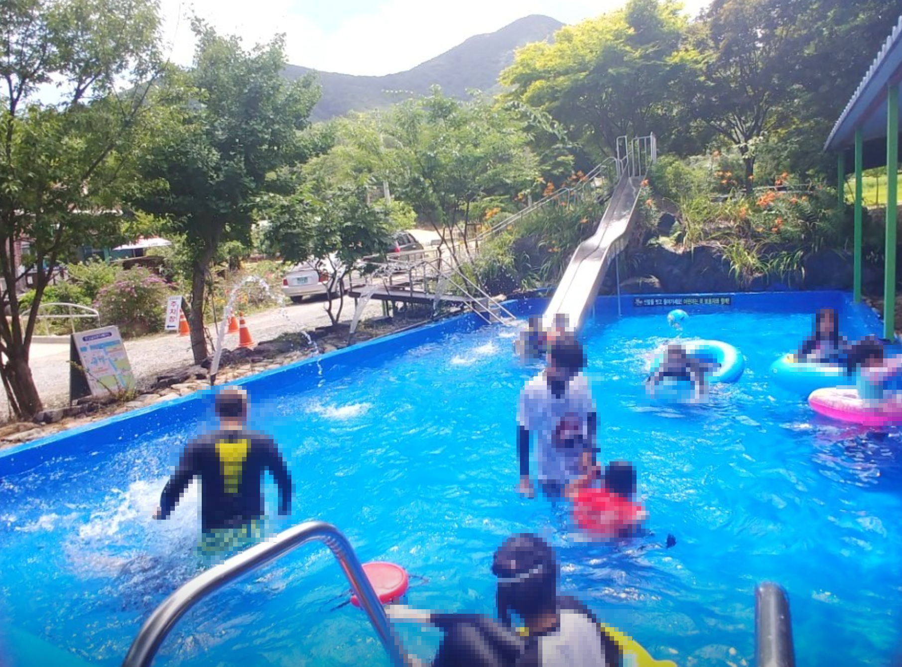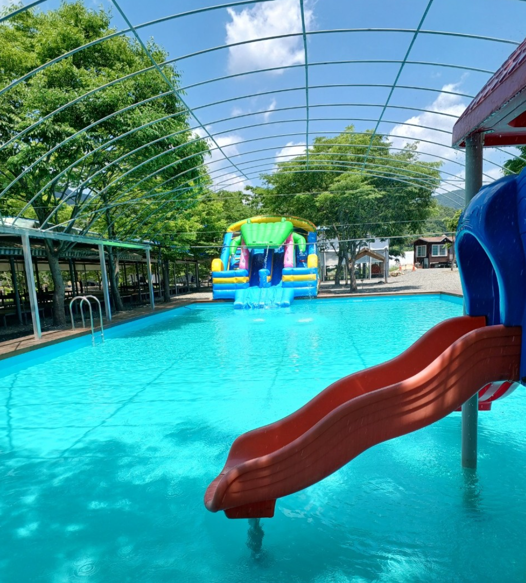 펜션과 함께 운영되며, 수영장과 에어슬라이드 등 아이들을 위한 놀이시설이 잘 갖춰져 있습니다. 계곡 접근성도 좋습니다.