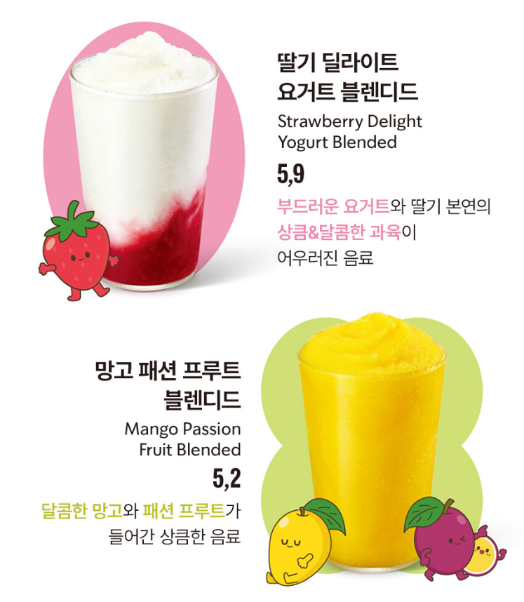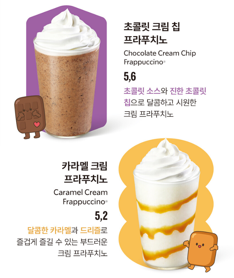 - 음료 종류: 딸기 딜라이트 요거트 블렌디드, 망고 패션 프루트 블렌디드, 초콜릿 크림 칩 프라푸치노, 카라멜 크림 프라푸치노