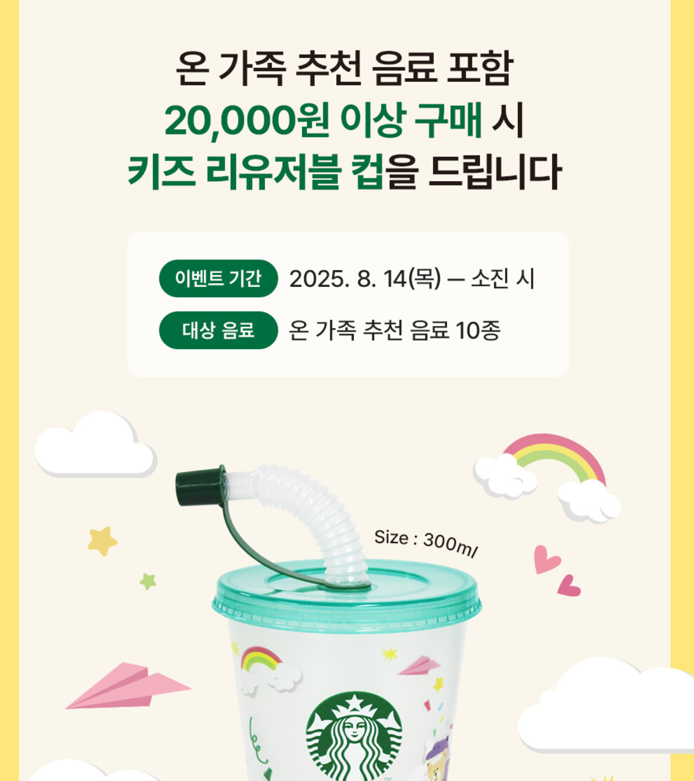 - ✨ 조건: 아래 '이벤트 대상 음료 10종' 중 1잔을 포함하여, 총 20,000원 이상 구매 시 키즈 리유저블 컵 1개 증정