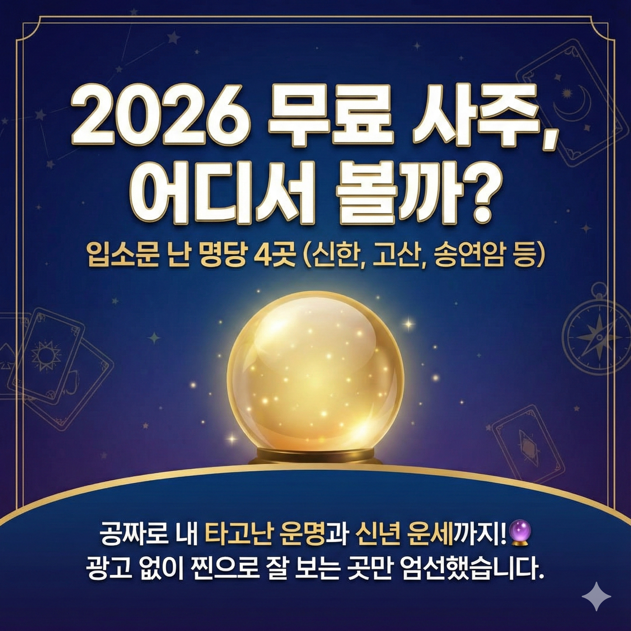 "2026년 나의 운세, 어디서 공짜로 볼까?" 🔮 신년 운세부터 내 타고난 사주팔자까지! 신한생명, 고산 엄창용 등 이미 입소문 난 무료 사주 명당 사이트 4곳을 엄선했습니다. 이용 시 주의사항과 무료 사주의 신뢰성까지 한 번에 확인하세요.