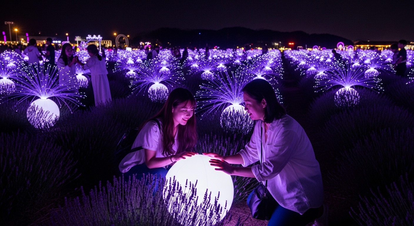 이 축제의 하이라이트는 단연코 밤 10시까지 이어지는 야간개장이에요. 해가 진 뒤 조명이 켜지면, 라벤더 정원은 낮과는 전혀 다른 로맨틱한 공간으로 변신해요. 마치 보랏빛 별들이 땅으로 내려앉은 듯한 풍경 속에서 인생샷, 안 남길 수 없겠죠?