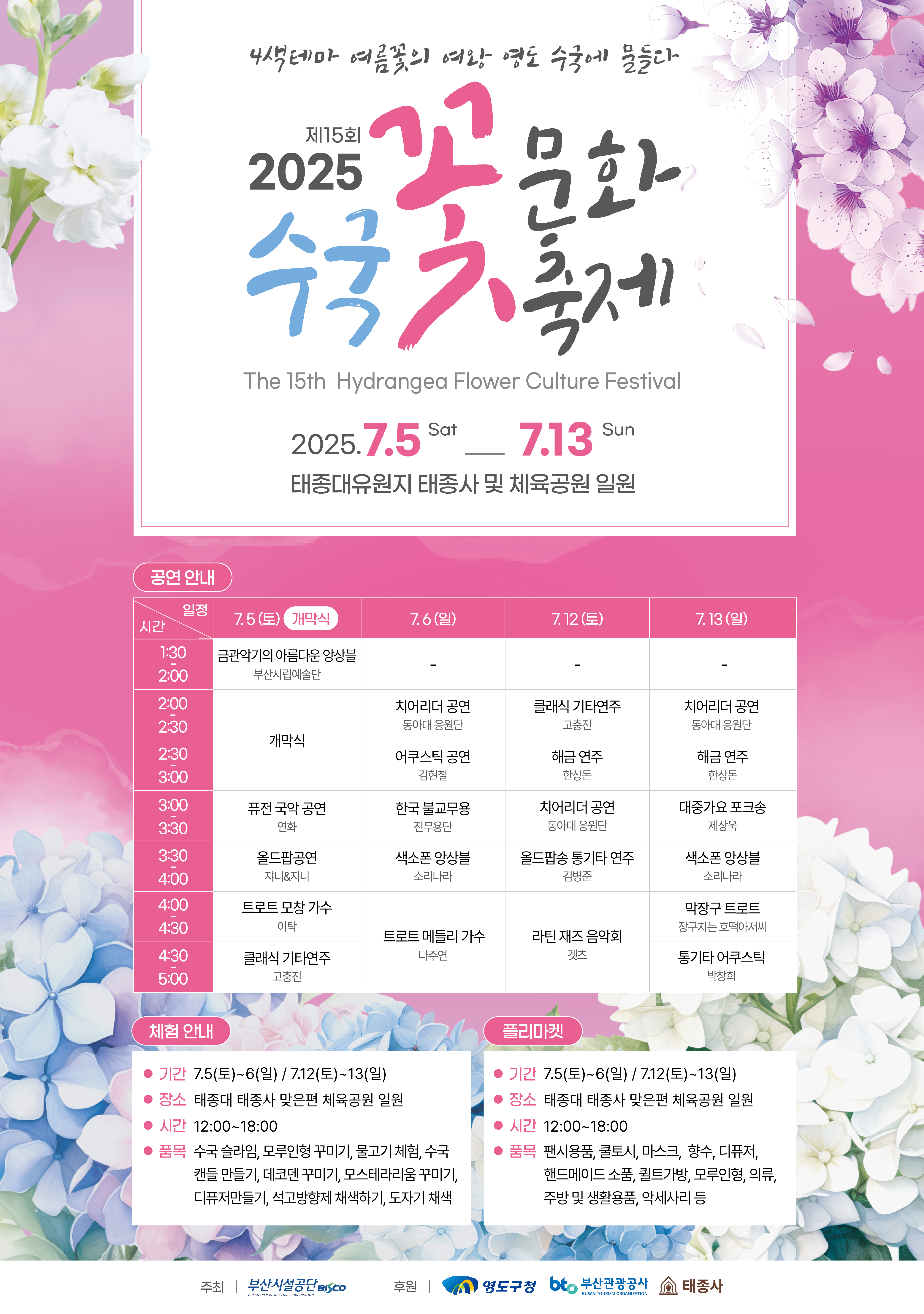 오랜 기다림 끝에 우리 곁으로 돌아온 2025 태종대 수국꽃 문화축제! 탐스럽게 피어난 수국처럼, 여러분의 여름도 풍성하고 아름다운 추억으로 가득 채워지기를 바랍니다.