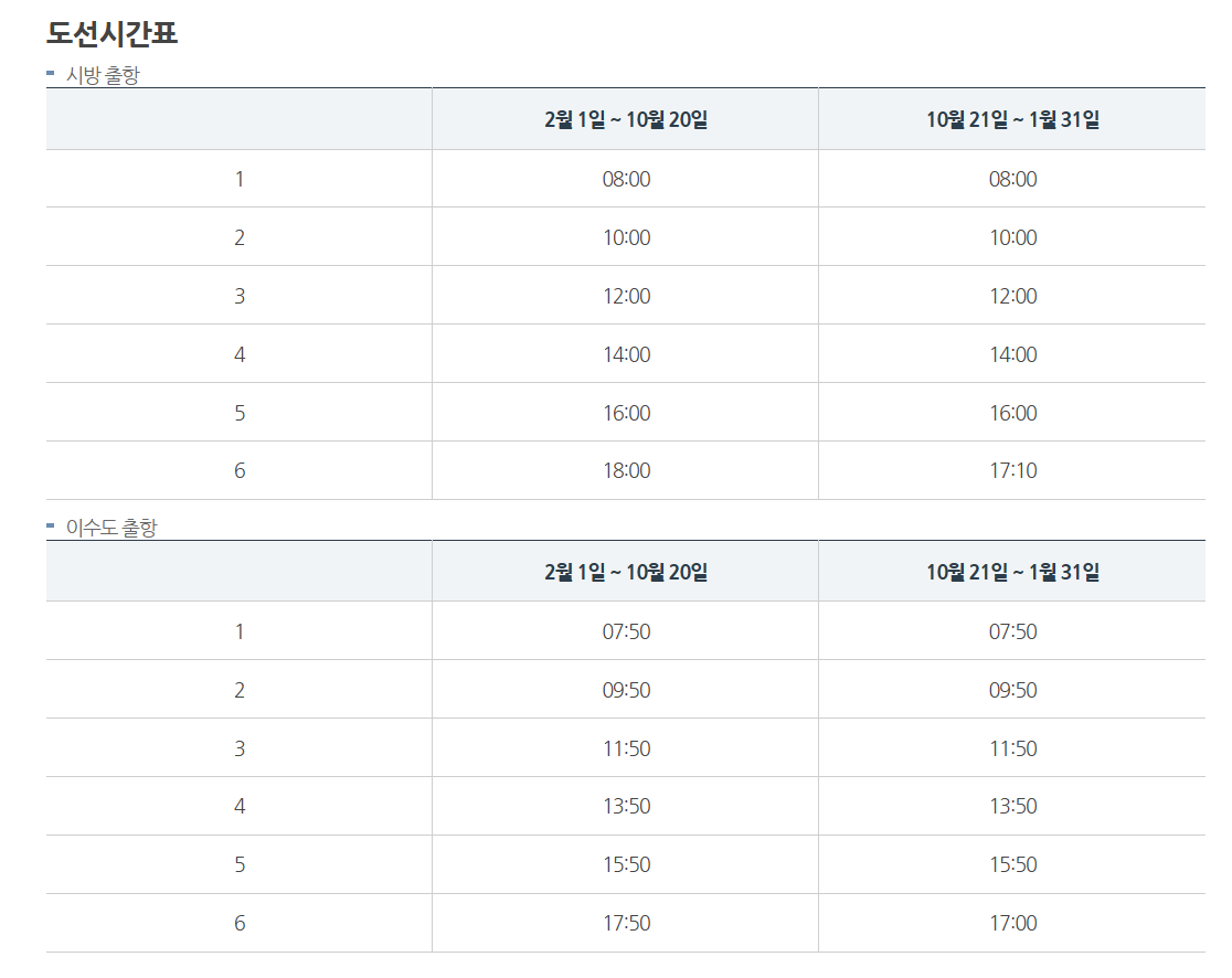 - 이수도 출발: 07:50, 09:50, 11:50, 13:50, 15:50, 17:50 (막배)